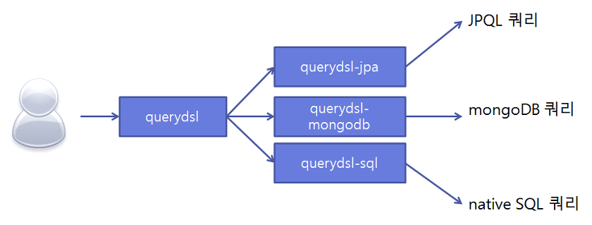 다양한 데이터베이스는 모두 자신만의 데이터 검색을 위한 Query 문법을 갖는다. 단적인 예로 Oracle에서 페이징을 위해 Rownum을 이용하는 반면, MySQL에서는 Limit을 이용한다. 이렇게 다양한 데이터 쿼리 솔루션들의 쿼리 문법을 모두 익히는 것은 쉽지 않은 일이다. Queyrdsl은 몇 가지 데이터 관리 엔진에 대해 하나의 통일된 문법으로 쿼리를 작성할 수 있게 해준다.