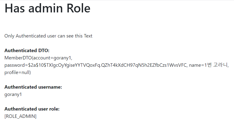 'gorany1'이라는 ID로 로그인을 했고, ADMIN이라는 권한을 갖기에 위와 같이 출력되었다. 스프링 시큐리티에서는 username이 사용자의 이름이 아닌 사용자의 ID를 나타냄에 항상 유의하자.