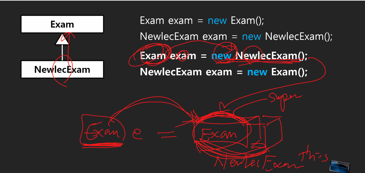 맨 마지막 줄은 아무 문제가 없을까? 답은 No이다. exam의 참조 타입은 Exam이므로 NewExam이 갖는 공간에 접근할 수 없다. 그렇다고 NewExam이 갖는 avg()와 int com은 존재하지 않는 것일까?