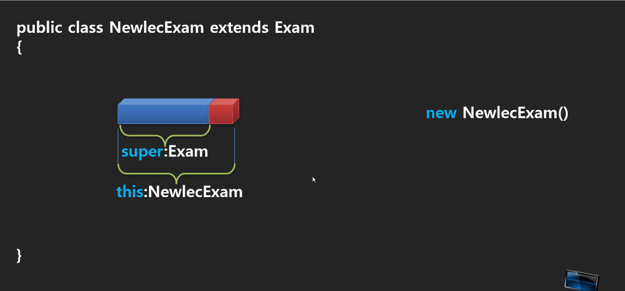 아래를 메모리라고 했을 때, Exam e = new NewExam()으로 생성한다면 파란색 부분만 참조하게 되는 것이다.
