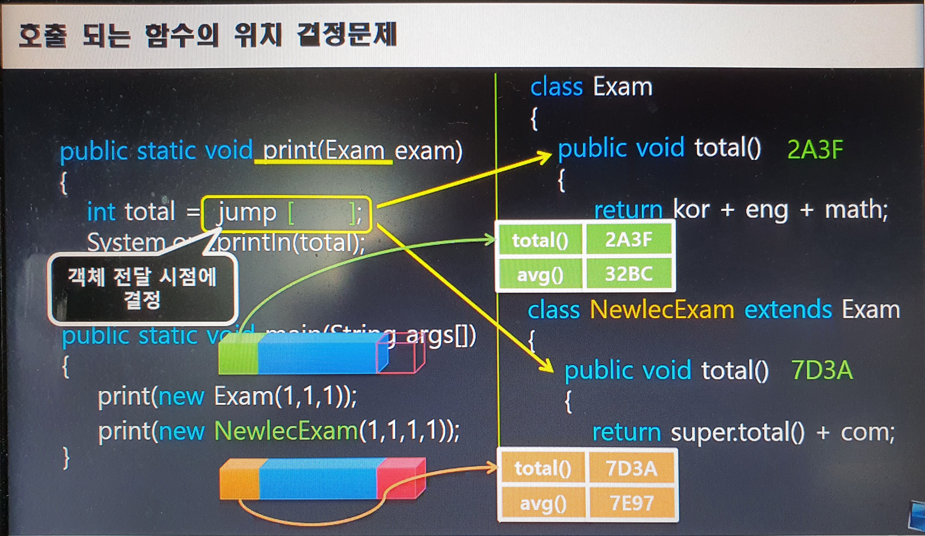 즉, 객체는 자신이 갖는 메서드들에 대한 주소를 갖고 있는 것이다. 그래서 print(Exam exam)이 실행될 때, Exam의 total()이 호출될지, NewExam의 total()이 호출될 지 여부는 컴파일 시에 결정( 정적 바인딩 )되는 것이 아니다.