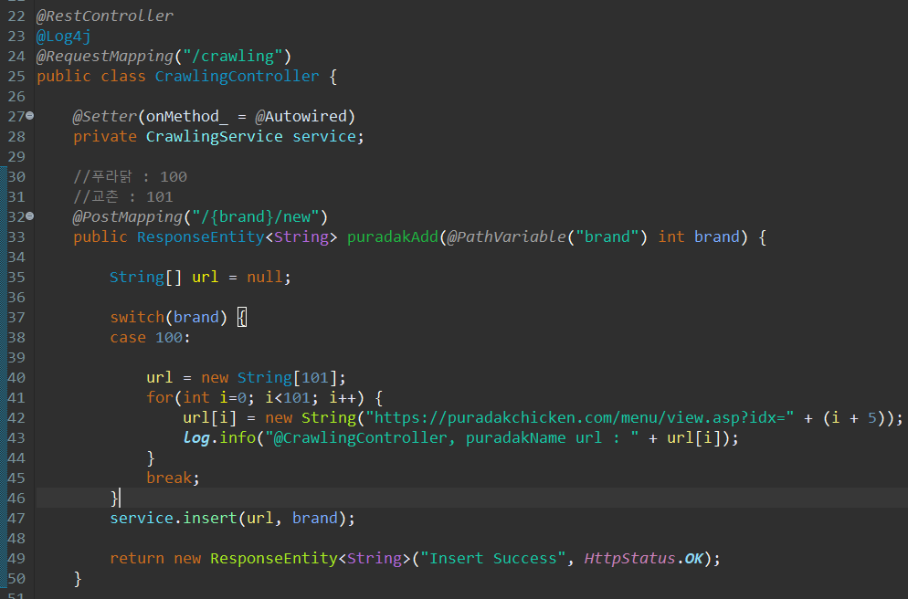 > CrawlingController의 메서드이다. 마찬가지로 ResponseEntity 객체를 반환하는데, 굳이 안써도 된다.