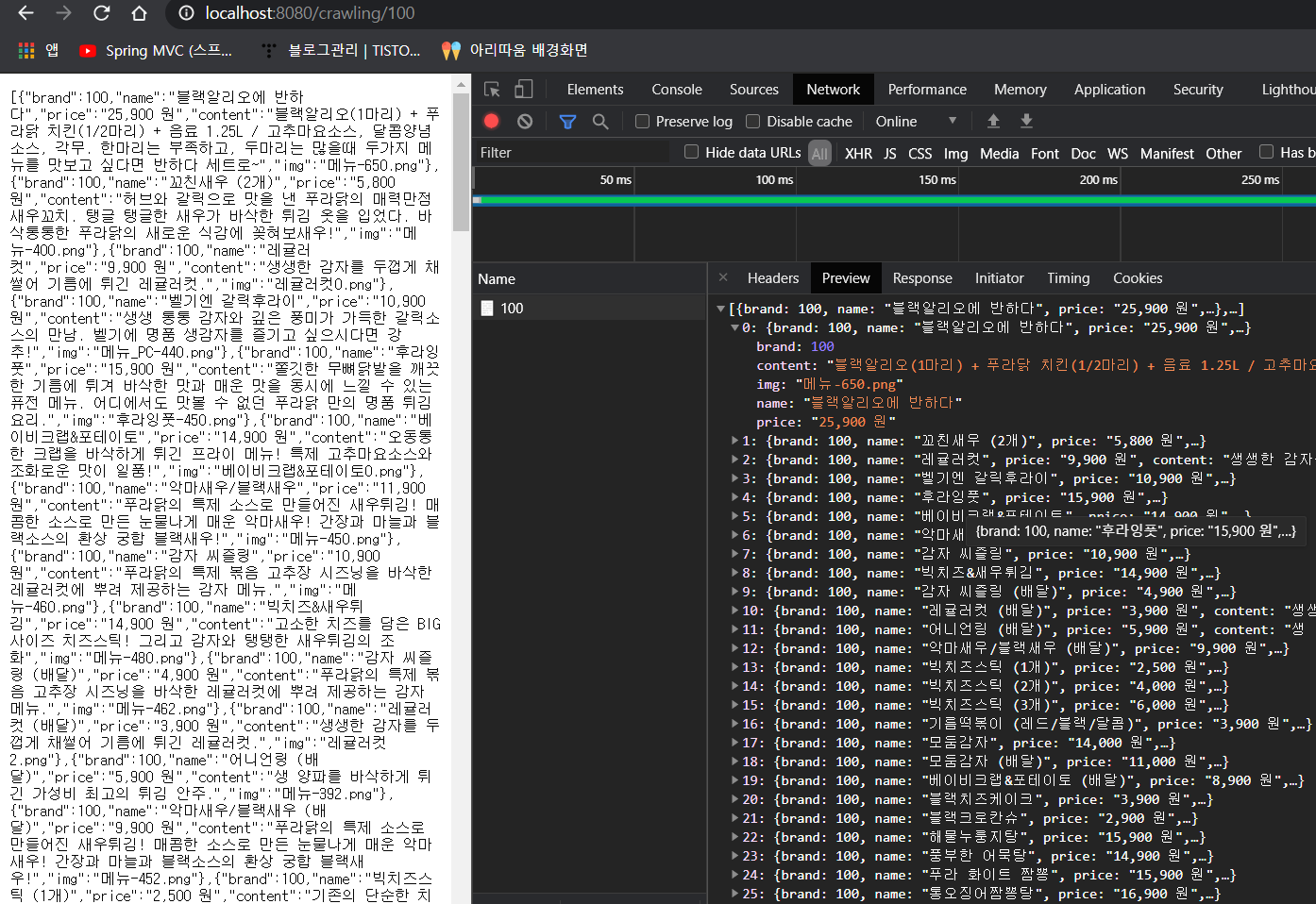 > url에 /crawling/100을 입력하면 다음과 같이 나온다.