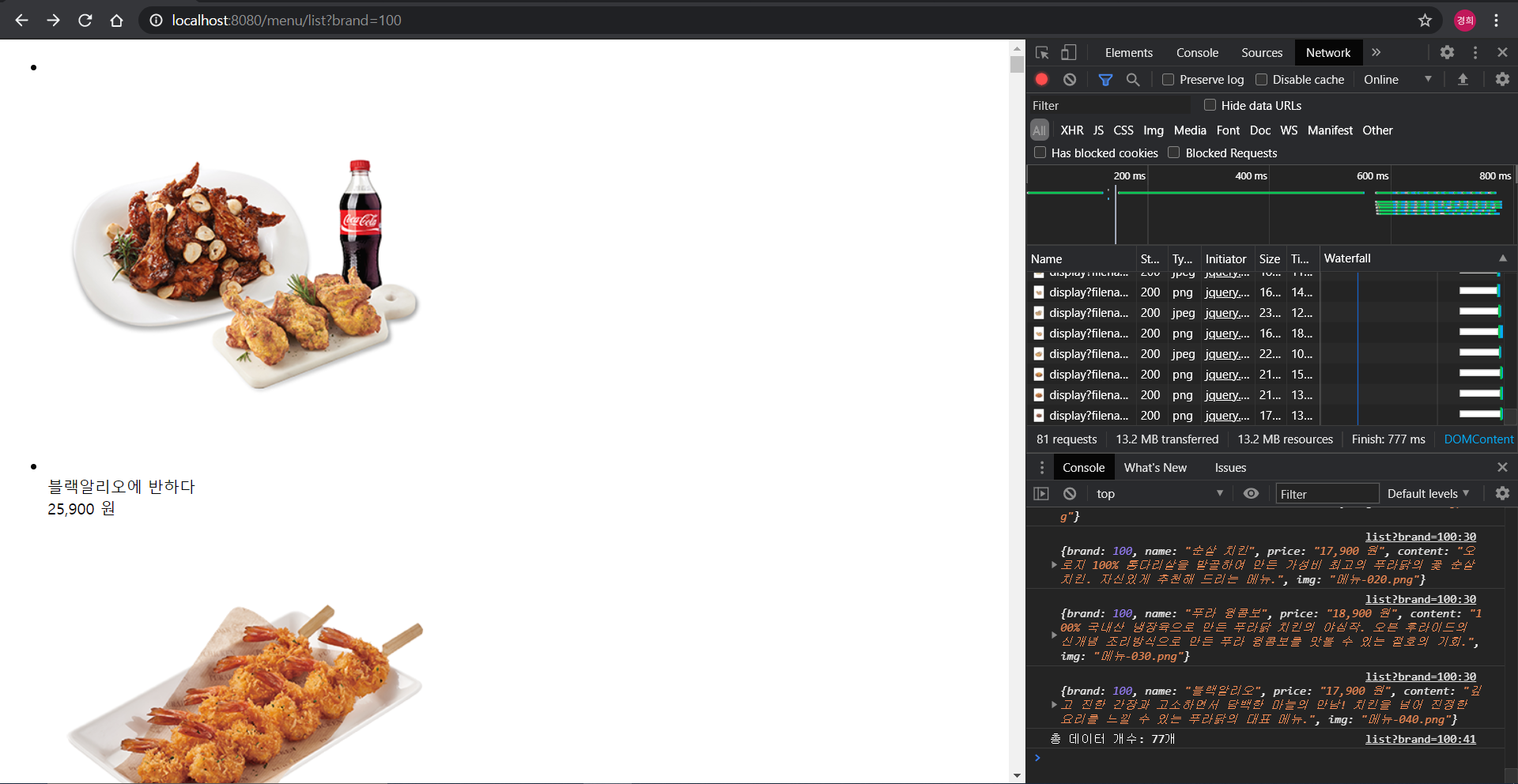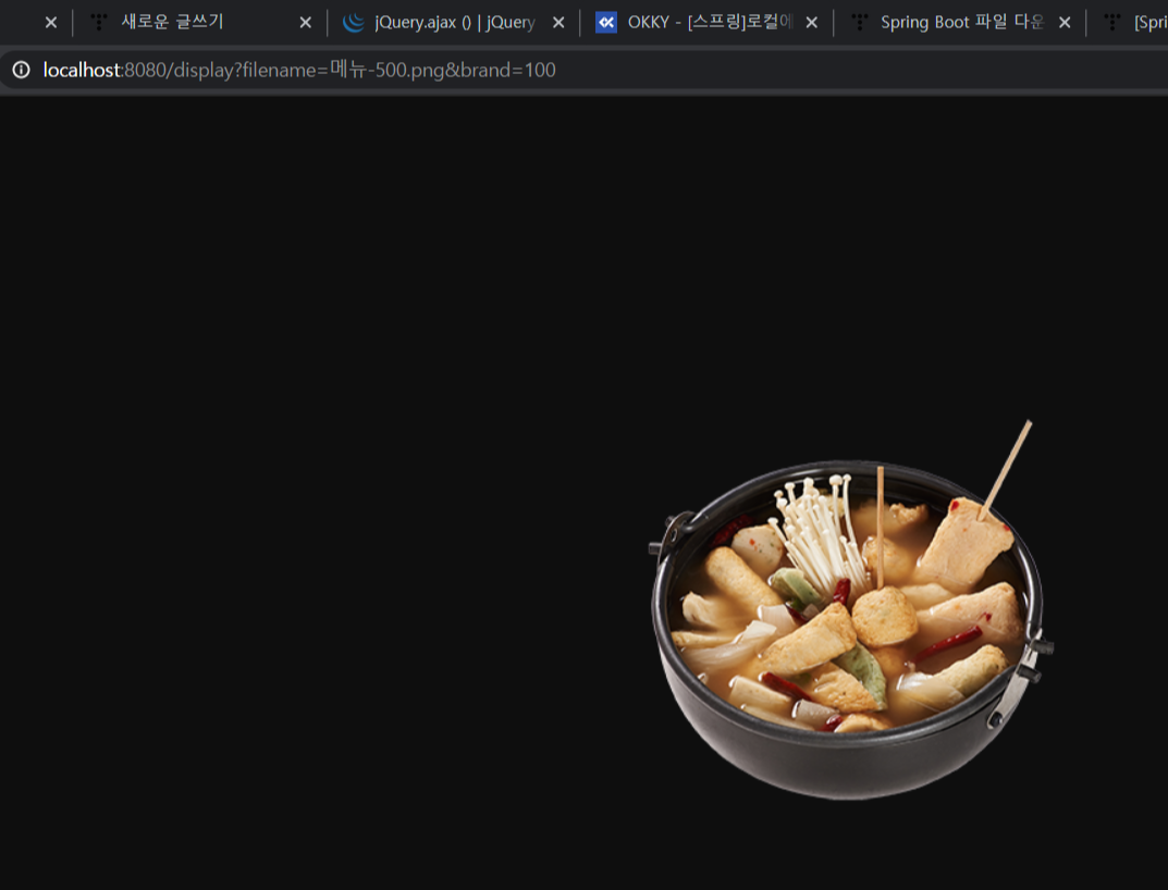 > 호출하는 URL은 '/display?filename=메뉴-500.png&brand=100'이고 실제로 이미지가 잘 출력되었다.
