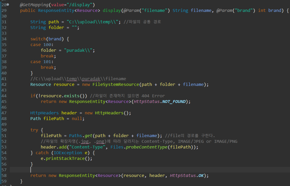 * UploadController를 생성해 이미지 파일 display를 담당하는 메서드를 만들어준다.