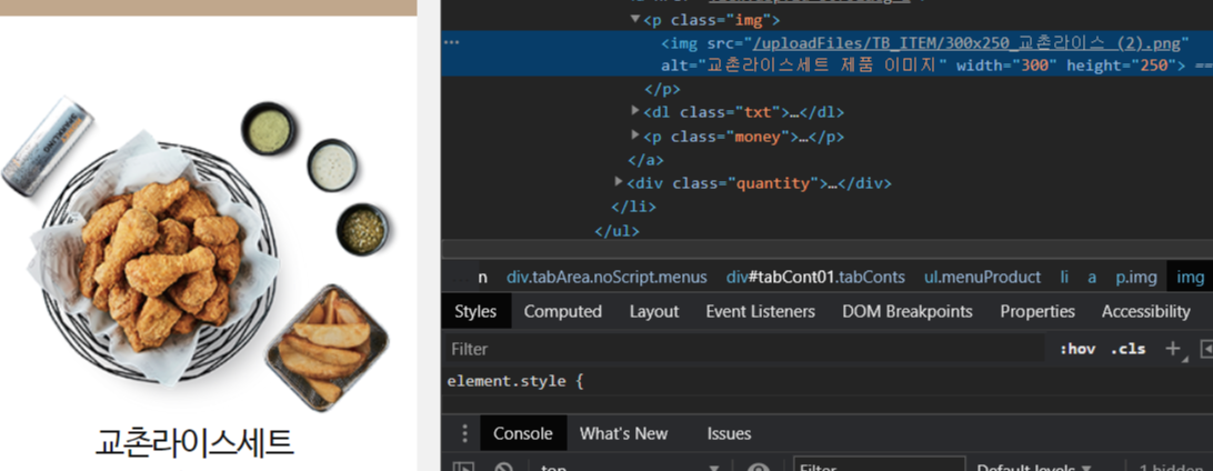 * 교촌치킨의 메뉴 중 '교촌라이스세트'라는 메뉴의 이미지 src값은 다음과 같다.