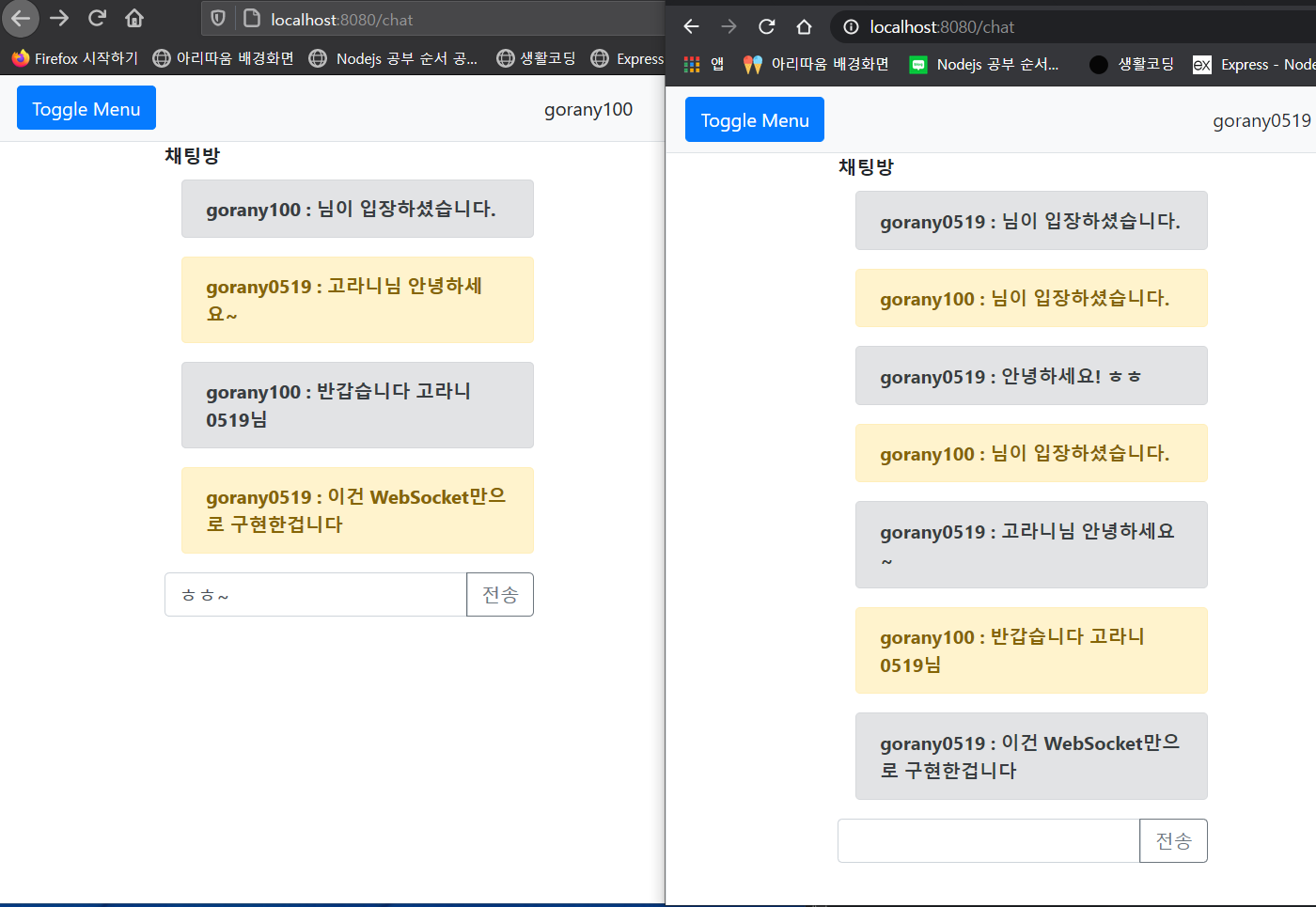 text박스에 Hello World를 쓰고 전송을 누르면 "gorany100:Hello World!" 이런 문자열이 전송되게 된다.