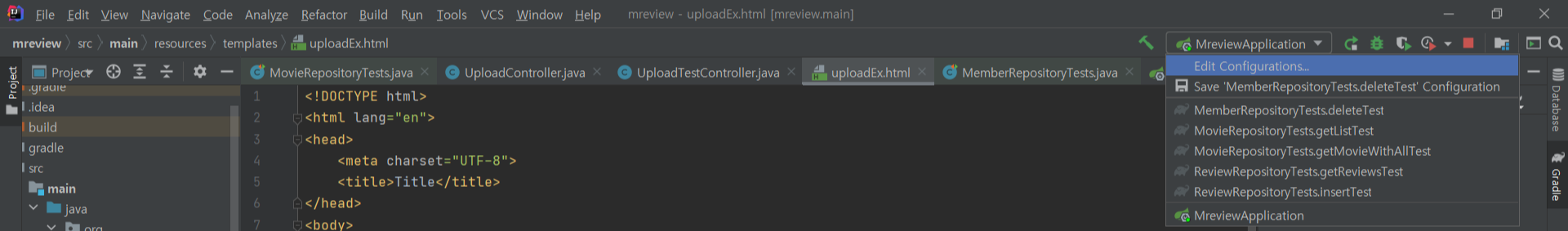 망치 아이콘 옆에 목록을 누르면 여러 실행할 수 있는 클래스가 주르륵 나오는데 다 필요없고 'Edit Configurations.'를 클릭한다.