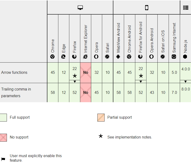 실제로 MDN에서 확인한 결과 브라우저 호환성은 다음과 같다. IE는 버전과 상관없이 지원하지 않는다.