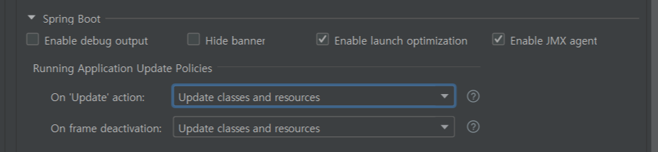 요 부분을 포함하는 설정 창이 하나 뜨는데, 위 부분에서 On 'Update' action과 On frame deactivation 부분의 디폴트 값으로 "Do nothing"으로 체크되어있을 것이다. 이를 위와 같이 변경해주면 서버를 재시작하지 않아도 뷰 페이지 변경이 있을 시 바로바로 적용해준다.