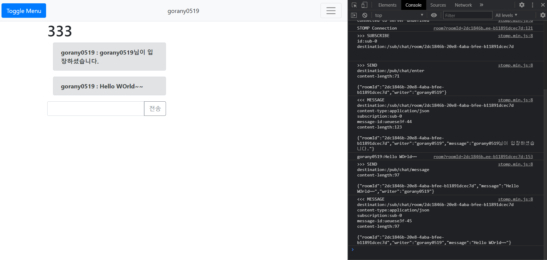 STOMP를 사용하면 개발자 도구 콘솔에 자동적으로 통신의 내용이 찍힘을 알 수 있다.