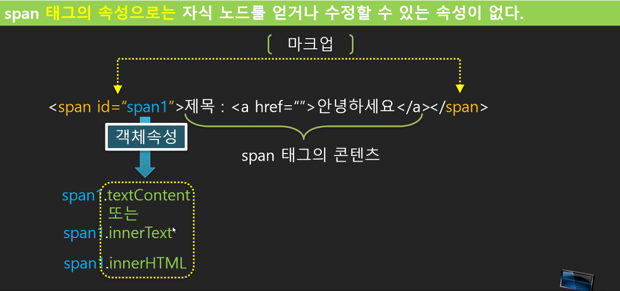- innerHTML : 결과 = 제목 : <a href="">안녕하세요</a>