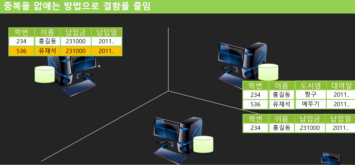 사실 데이터베이스가 존재하기 전부터 데이터를 관리하고 있었다. 위의 그림을 대학 캠퍼스라고 보면, 행정실, 도서관, 과사무실 이라고 보았을 때, 데이터를 각각 관리하였다. 그런데 학생의 데이터는 모든 곳에서 사용이 되는데, 동기화가 잘 안되는 것이다. 예를 들어 책을 빌리는 과정을 생각해보면, 휴학생에게는 도서 대출이 안된다. 유재석 학생이 오늘 복학했고, 도서관에서 도서를 대출하려고 했는데, 아직 데이터상 처리가 안되어있는 것이다. 행정실과 도서관의 데이터 동기화(복사본)는 그날 저녁에 이루어지므로 아직 휴학생처리가 되어있는 것이다.
