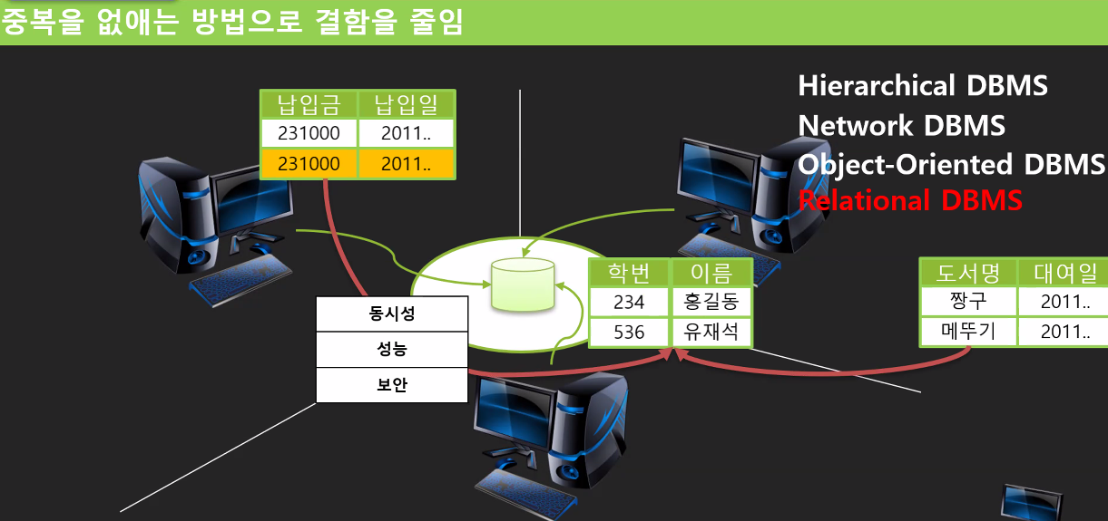 이를 해결할 수 있는 방법은, 데이터를 각자 갖고있는게 아닌, 데이터를 'base'화 시켜서 사용하는 것이. 즉 데이터를 한 곳에 모아서 관리하고, 데이터의 중복을 없애는 것을 생각한 것이다. 그런데 여기서도 문제점이 있다. 내가 홍길동이라는 이름을 수정하려고 했는데, 동시에 누군가 이를 지워버린다면..? 그리고 성능과 보안의 문제점도 존재한다. 이를 누군가 관리해주어야 하는데, 이를 관리해주는 역할이 데이터베이스 관리 시스템(DBMS)이다. (동시성, 권한, 성능 ..)