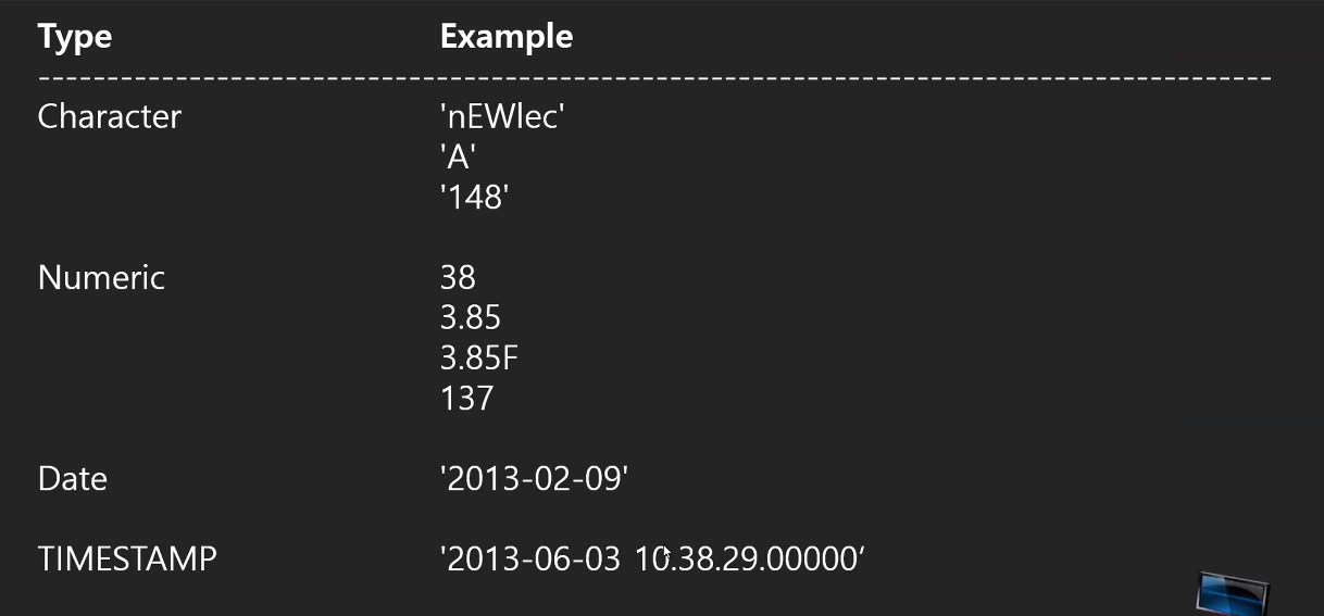 - DATE : 4712 BC ~ 9999 AD (EX: 01-JAN-99)