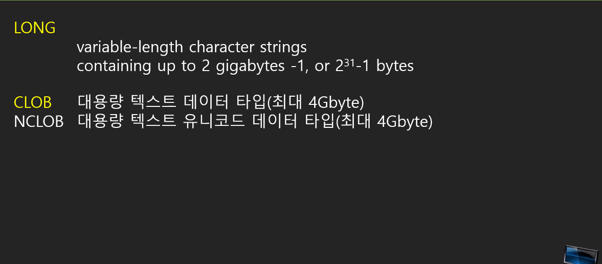 - TIMESTAMP WITH TIME ZONE : NLS_TIMESTAMP_TZ_FORMAT 파라미터에 명시된 값을 따름