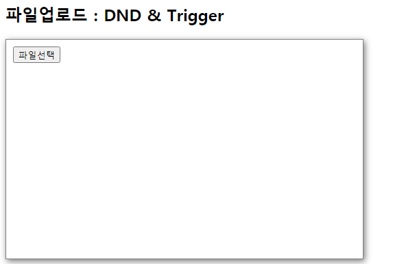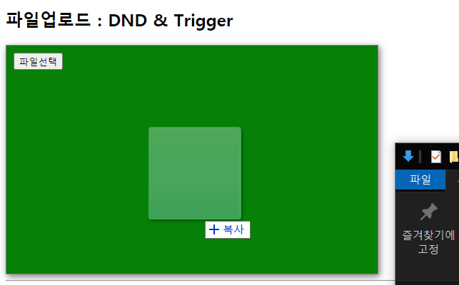 위 코드를 준비하고 페이지를 본다면 위와같은 화면을 볼 수 있다. 이제 파일 탐색기에서 파일을 하나 드래그해서 위의 박스에 끌고가면 배경이 초록색으로 바뀌는 것을 볼 수 있다.