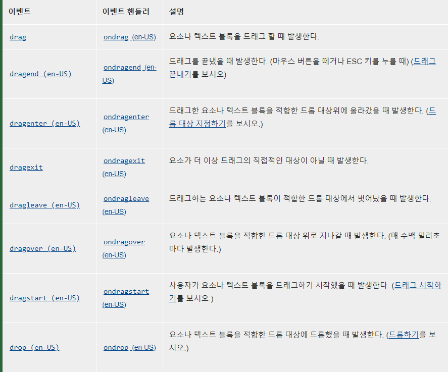 먼저 이벤트 중에 drag라는 이벤트가 있는데 이를 좀더 자세히 보면 다음과 같이 있다.