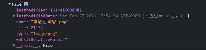 콘솔 로그에 출력되는 것을 보니 'files'라는 속성을 갖는다. 아마 저곳에 내가 원하는 정보가 담겨있으리라 생각되므로 콘솔에 찍어보도록 하자.