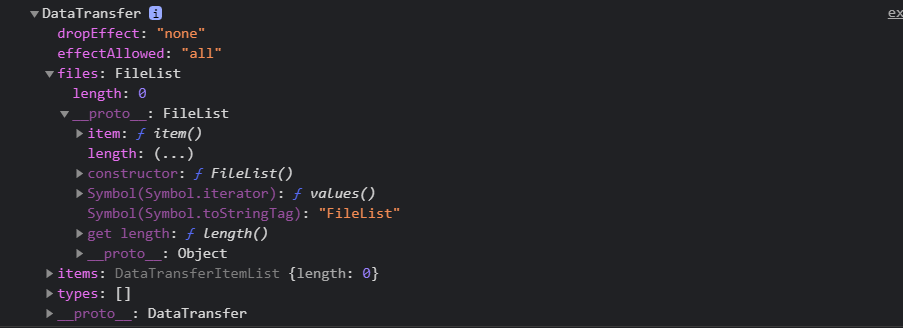 저 박스에 파일을 드래그 앤 드랍 했을 때 파일에 대한 정보를 가져오고싶을 수 있는데, 그 파일에 대한 정보는 어디서 얻어올까? 그 정보는 바로 event 객체가 갖는 DataTransfer 라는 녀석이 가지고있다. 이를 조금 자세히 보도록 하자.