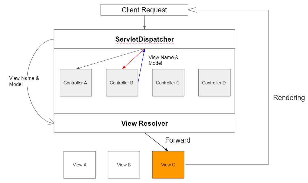 DispatcherServlet은 반환 받은 View Name을 가지고 View Resolver를 통해 View Page를 찾는다. 만약 View Name과 매칭되는 View Page를 찾는다면 그 View를 렌더링(ServletDispatcher에 의해)하여 클라이언트는 뷰 페이지를 보게 된다.