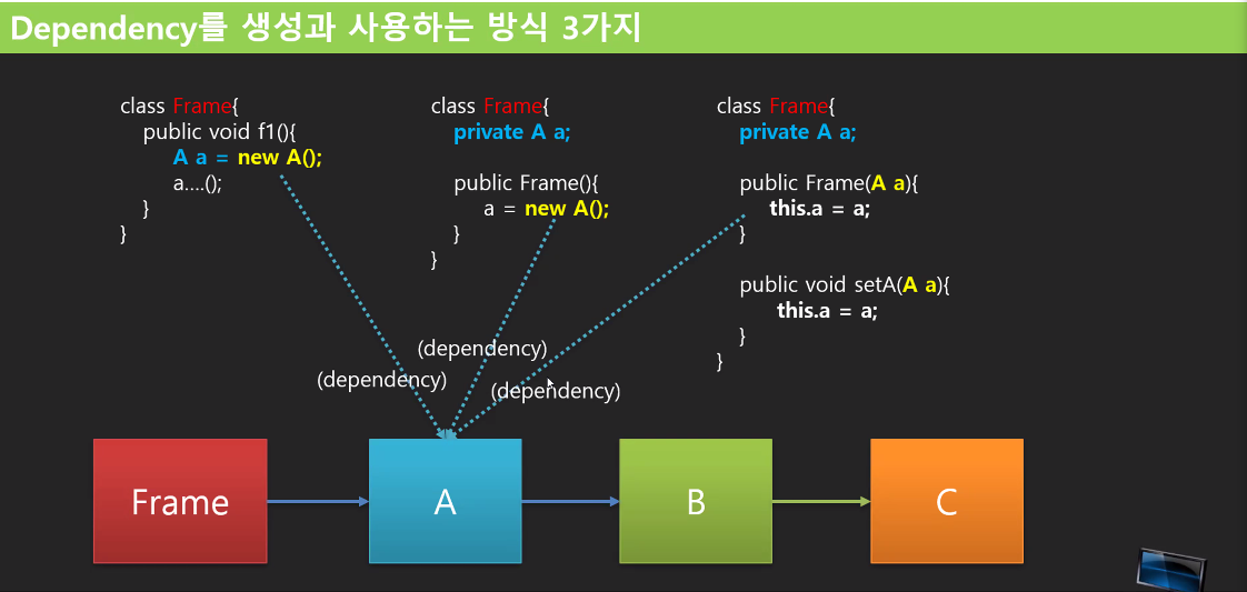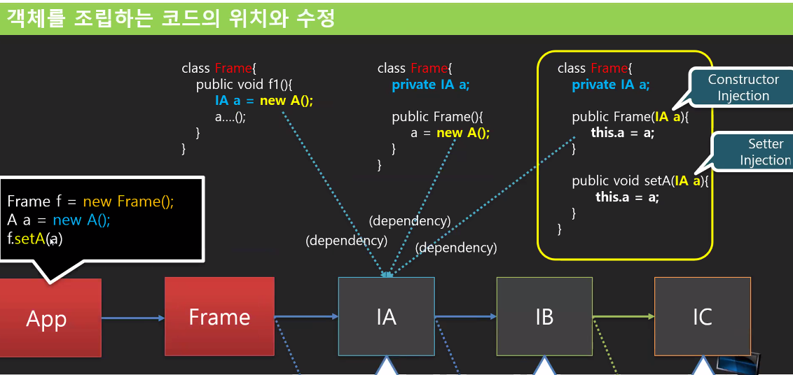 오른쪽은 Setter, Constructor 로 Injection를 하는 방법이다.