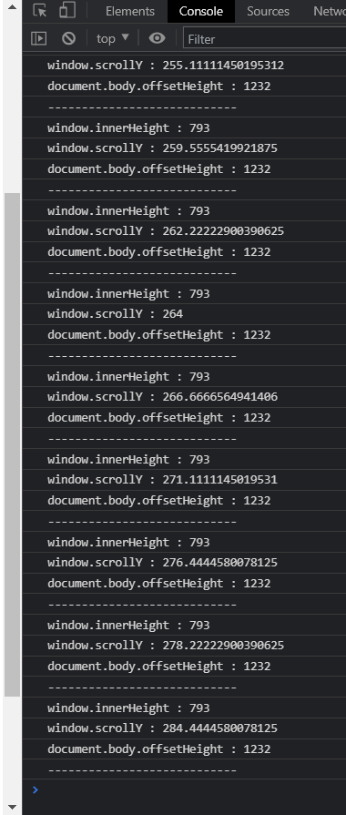 window.scrollY는 스크롤의 이동에 따라 값이 계속 변화하는 것을 알 수 있다.