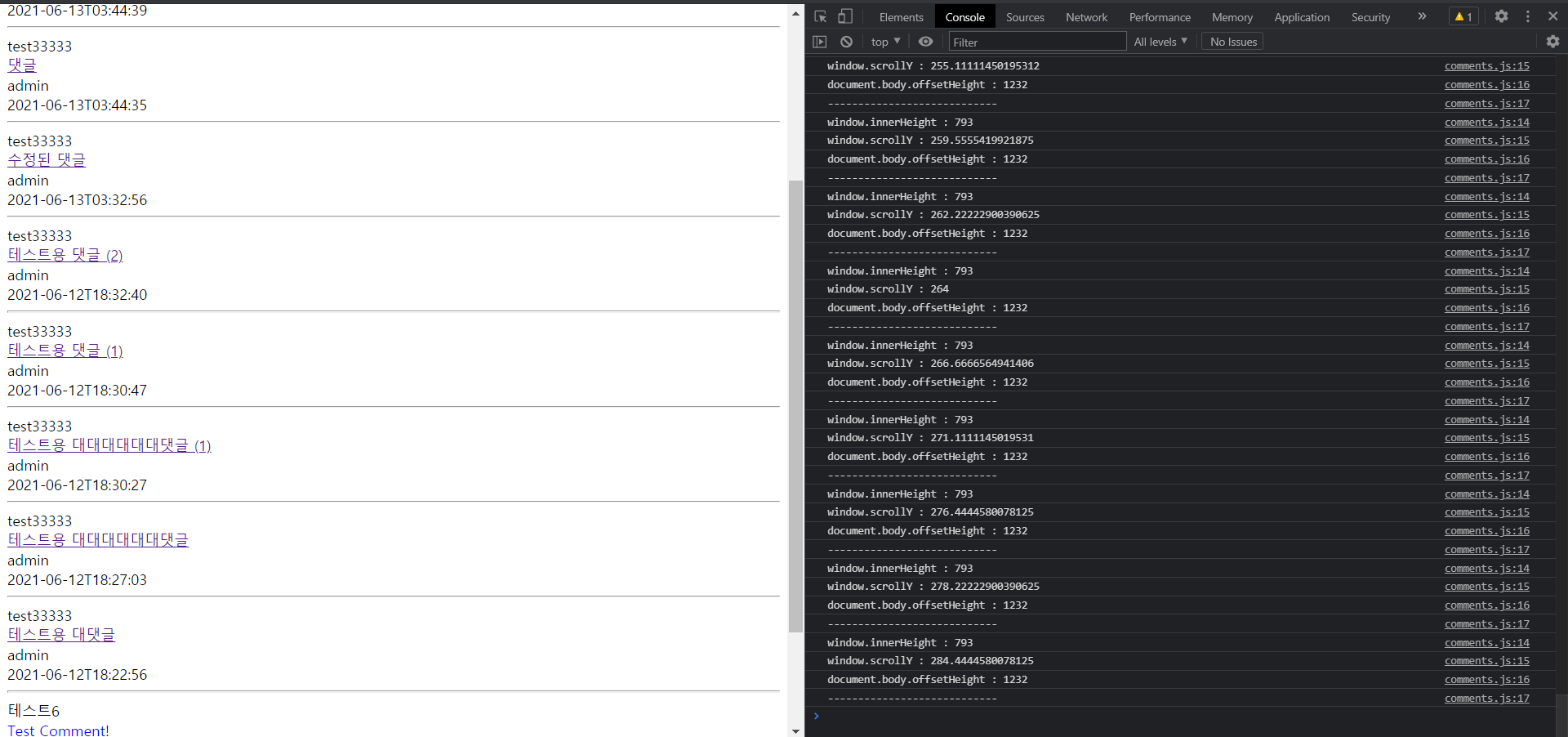 위 3가지만 잘 이용한다면 스크롤을 내림으로써 [더보기]버튼을 클릭하거나, 전통적인 방법의 < 1 2 3 4 5 >같은 오브젝트를 누르지 않아도 페이징을 구현할 수 있다.