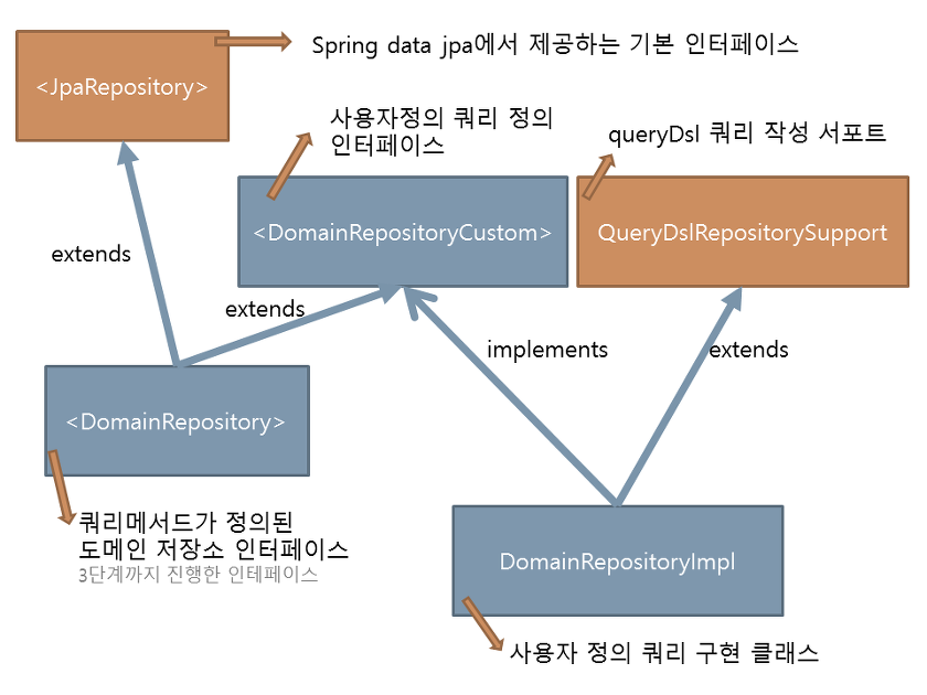 - 별도의 인터페이스에 대한 구현 클래스를 작성한다. 이 때, QuerydslRepositorySupport라는 클래스를 부모 클래스로 사용한다.