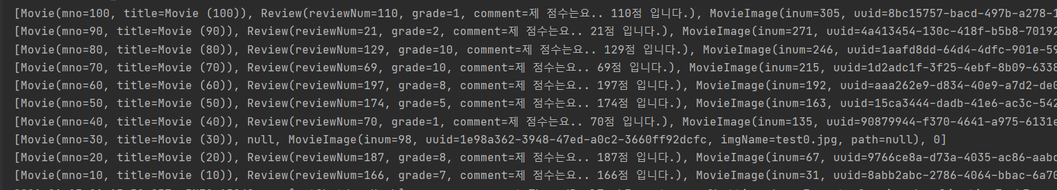 이렇게 만들어진 List<Tuple>에는 어떤 값이 들어있을까? 각 튜플에는 Movie의 데이터, Review의 데이터 MovieImage의 데이터가 담겨있다.