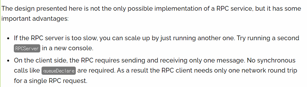 아마 의문이 들 수 있다. 왜 에러를 동반해 실패하는 것 보다 callback Queue의 불분명한 메세지들을 무시해야만 하는가? 서버 측의 경쟁 조건 가능성 때문이다. 가능성은 낮지만 RPC 서버가 응답을 보낸 직후 요청에 대한 확인 메세지(acknowledge message)를 보내기 전에 죽을 수 있다. 그렇게 되면 RPC 서버는 그 요청을 다시 처리할 것이다. 그렇기 때문에 클라이언트에서 중복 응답을 정상적으로 처리해야하고, RPC는 이상적으로 멱등적이어야 한다.