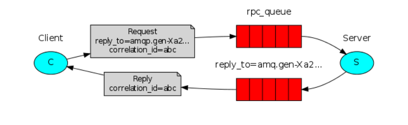 - RPC worker(aka. server)는 Queue에서의 요청을 기다린다. 요청이 나타났을 때 업무를 수행하고 Client에게 결과와 메세지를 보낸다. replyTo 속성의 Queue를 사용해서.