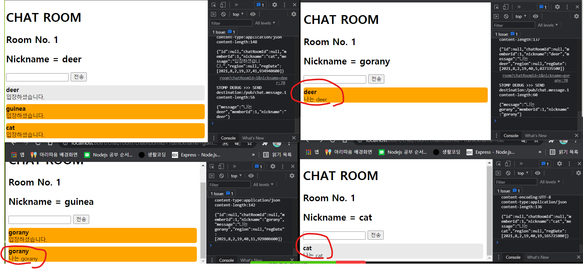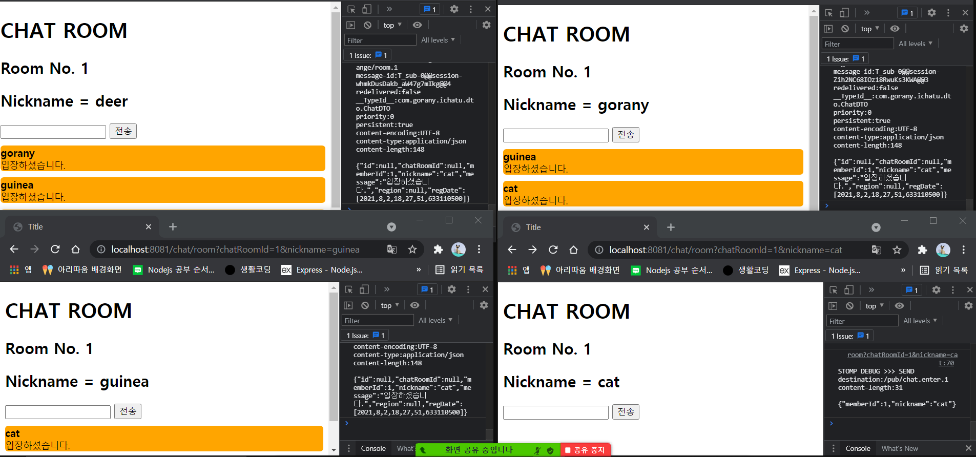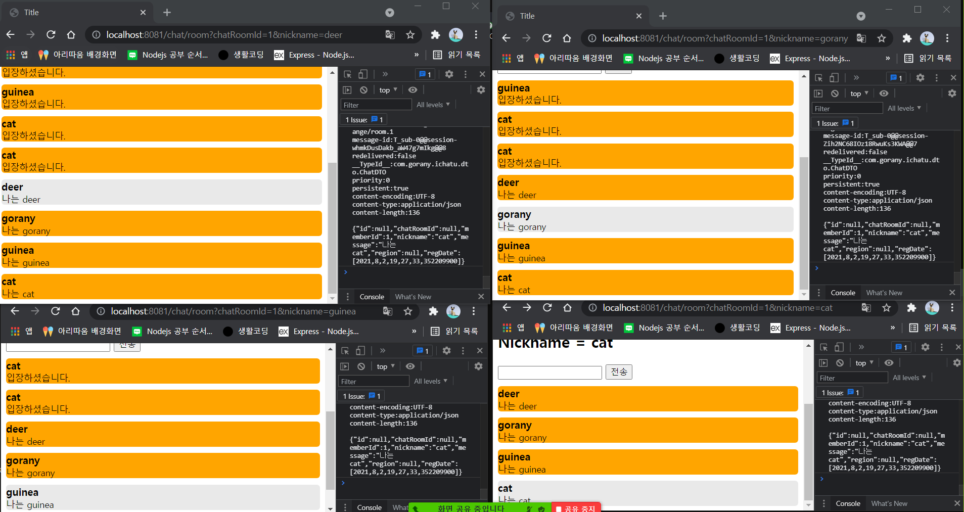 - 페이지의 refresh 없이 나 또는 다른 사람이 보낸 채팅을 받을 수 있어야 한다.