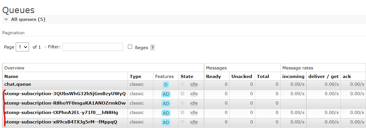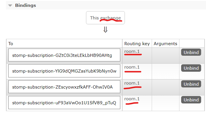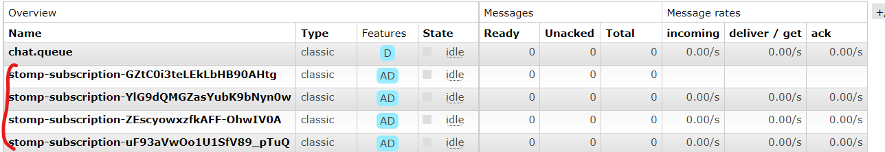 amq/queue 형태의 경우, 미리 만들어둔 Queue를 사용하기 때문에 따로 바인딩을 생각할 필요는 없다. 예를 들어 아까 우리가 만들어둔 [chat.queue]와 [chat.exchange]는 [room.*]이라는 라우팅 키로 바인딩을 시켜놓았고, 이 chat.queue라는 큐를 쓸 때 /amq/queue/chat.queue라고 써주면 된다.