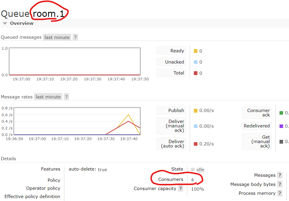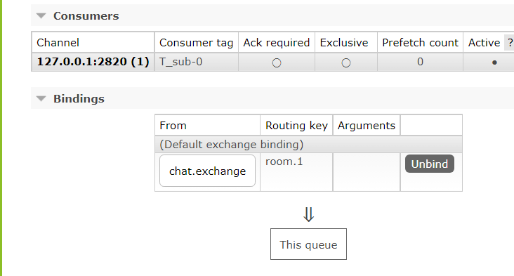 예상대로 room.1이라는 이름의 Queue가 생기고, 1번 채팅방의 모두가 Consumer가 된 것을 알 수 있다.