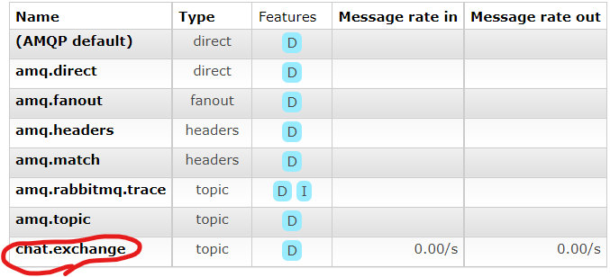 chat.exchange는 우리가 만든 것이고, 위에 나머지는 rabbit에서 기본으로 만들어준 것들이다. 아래서 몇 가지 exchange를 사용해볼 기회가 있을 것이다.