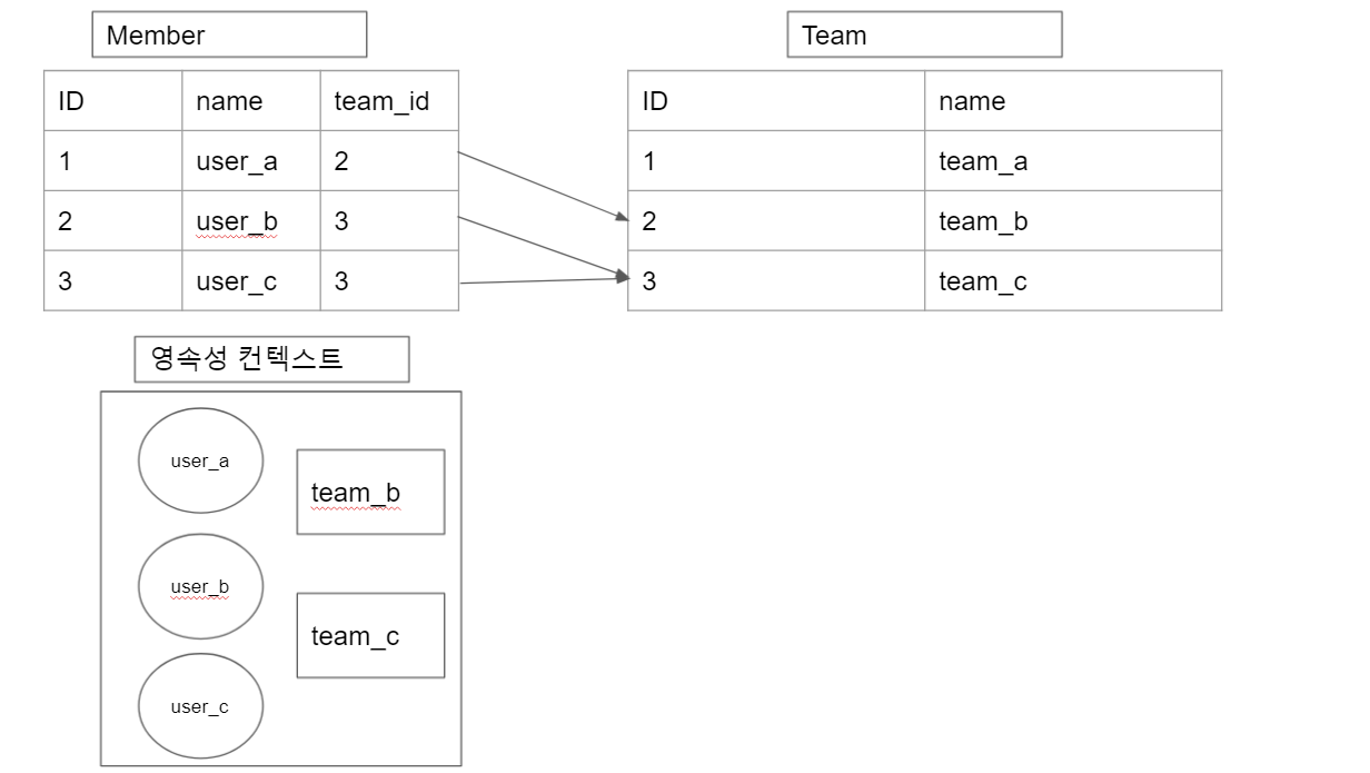 -> 즉시 로딩으로 설정 했기에 em.find() 시 Member에 연관된 Team까지 땡겨와 영속성 컨텍스트에 저장한다.