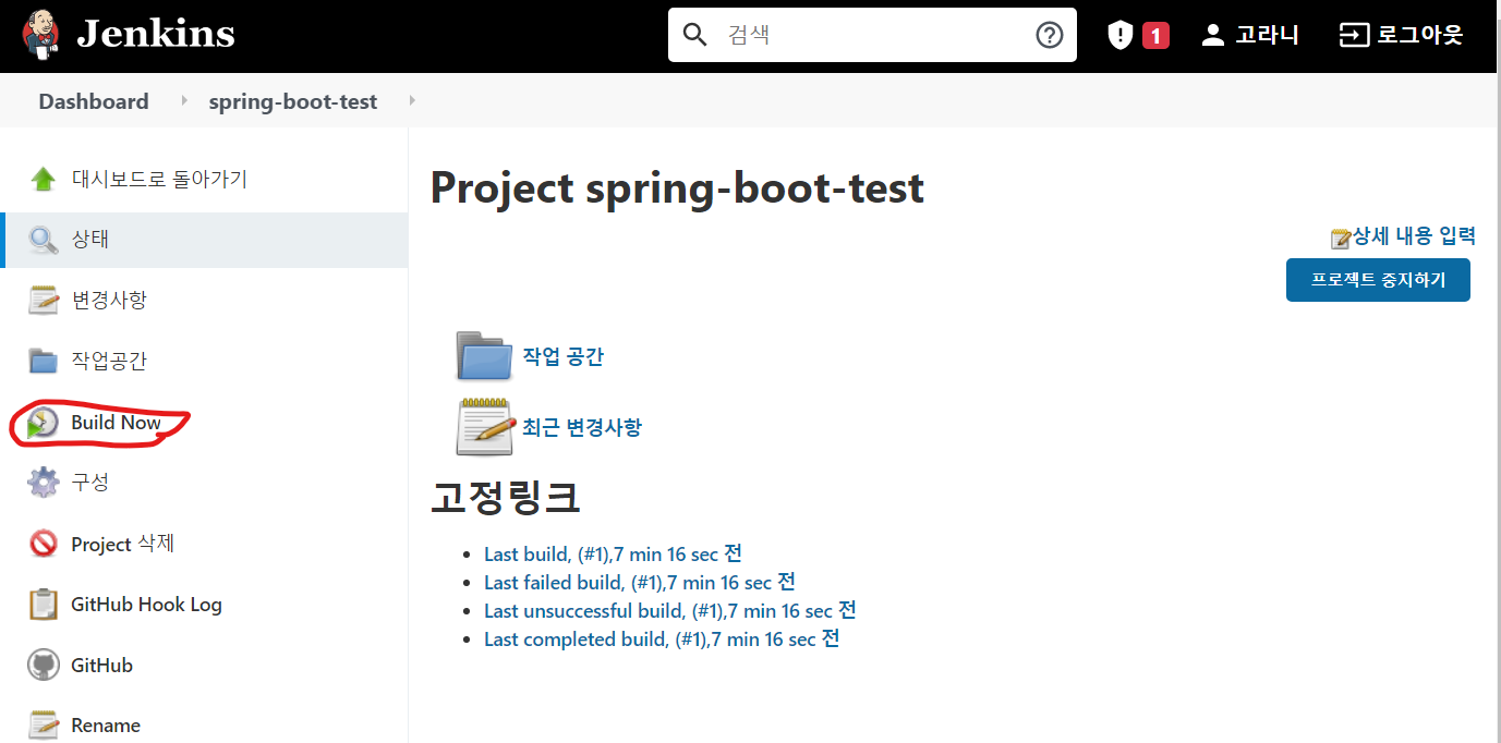 여기까지 잘 설정이 되었다면, Build Now를 눌러 빌드를 시도해보자.