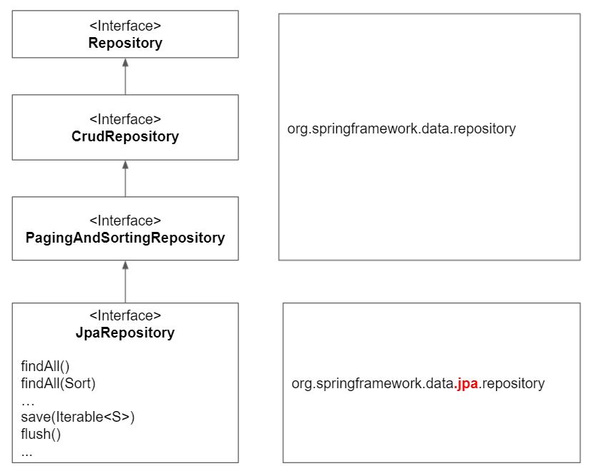 JpaRepository는 위와 같은 구조를 갖는다. 즉, JpaRepository는 오직 JPA만을 위해 특화된 녀석이고, 위의 상위 타입은 Spring Data 프로젝트에서 공통으로 갖는 기능을 정의해두는 녀석들이다.