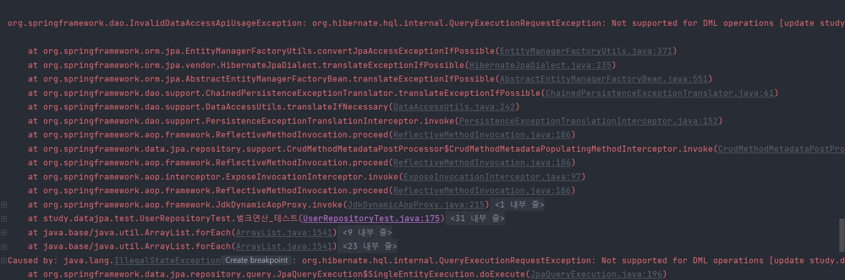 별로 다를 건 없다. 쿼리 메서드로 사용하는 것 말곤... 하지만 여기서 하나 다른점이 있다. 위를 그대로 동작하면 예외가 터진다. 다음 테스트를 돌려보자.