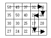 현재 제일 왼쪽 위 칸이 나타내는 지점에 있는 세준이는 제일 오른쪽 아래 칸이 나타내는 지점으로 가려고 한다. 그런데 가능한 힘을 적게 들이고 싶어 항상 높이가 더 낮은 지점으로만 이동하여 목표 지점까지 가고자 한다. 위와 같은 지도에서는 다음과 같은 세 가지 경로가 가능하다.