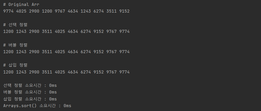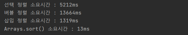 정렬이 많이 되어있는 난수 배열이 들어왔었는지 삽입 정렬 시간이 제일 짧았다. 그러나 역시 이 정렬 방법들은 가장 간단하고 기본적이지만, 자원 소모가 심한 정렬 방법이므로 차라리 기본 제공되는 Arrays.sort 또는 Collections.sort (Java에서)를 쓰는 것이 간편하고 가독성도 높일 수 있다.