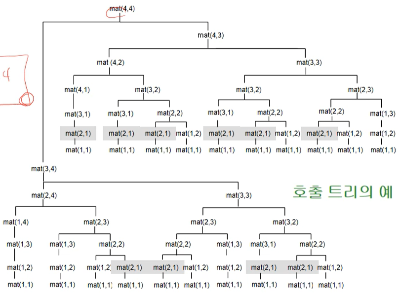 - 재귀적 해법으로 풀면 같은 문제에 대한 재귀호출이 심하게 중복됨