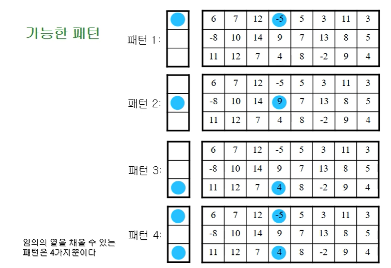 - 3 X N 테이블의 각 칸에 양 또는 음의 정수가 기록되어 잇다.