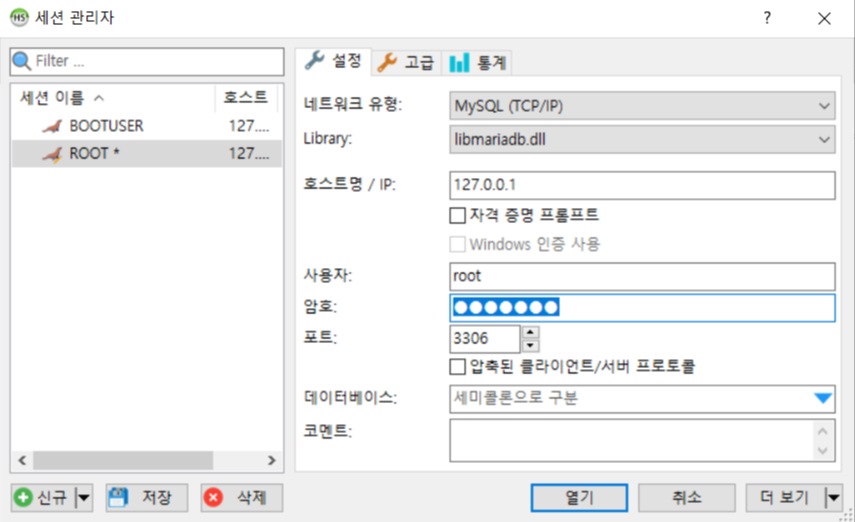 HeidiSQL를 실행하여 'ROOT'계정으로 접속한다. Password는 MariaDB를 설치할 때 설정한 Password를 사용한다.