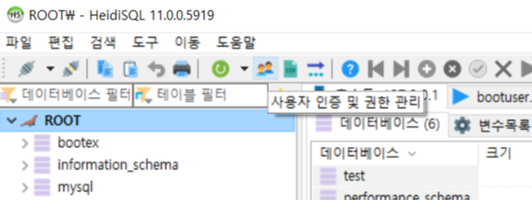 HeidiSQL에서 사이좋은 사람 아이콘(사용자 인증 및 권한 관리)를 누른다.