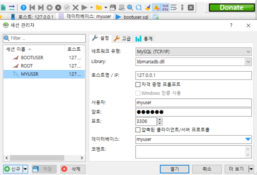 HeidiSQL을 재시작하여 신규 사용자를 생성한다. 이름은 MYUSER이며 사용자는 myuser, 암호는 아까 설정해준 암호를 입력한다.