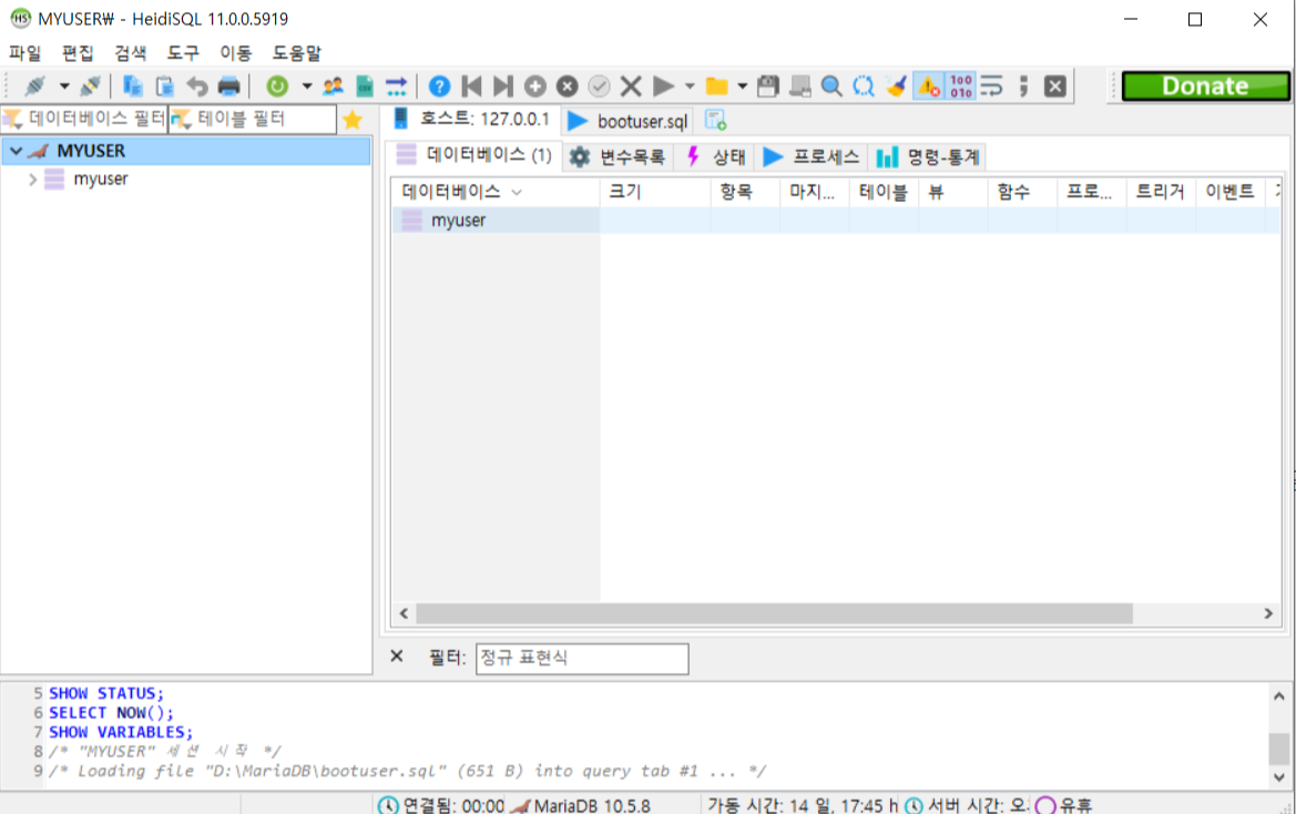 그럼 다음과 같이 MYUSER 데이터베이스만 사용할 수 있는 화면이 나온다.
